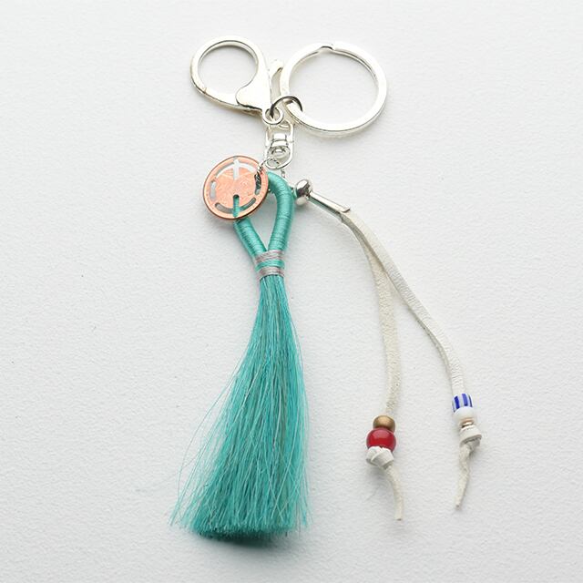 ホースヘアーを染めたフリンジやシルバー製のスカッシュブロッサム、EQ Lucky Pennyなどを組み合わせたキーリング。