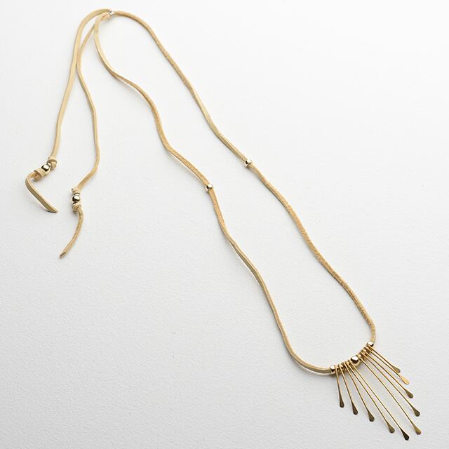 <EQUALIZE>ロゴがスタンプされたシルバーの留め具により長さ調節も可能。後に垂れる革ひもを前に垂らしたり、後ろに垂らしたりすることで異なる表情を楽しめるアイテムです。