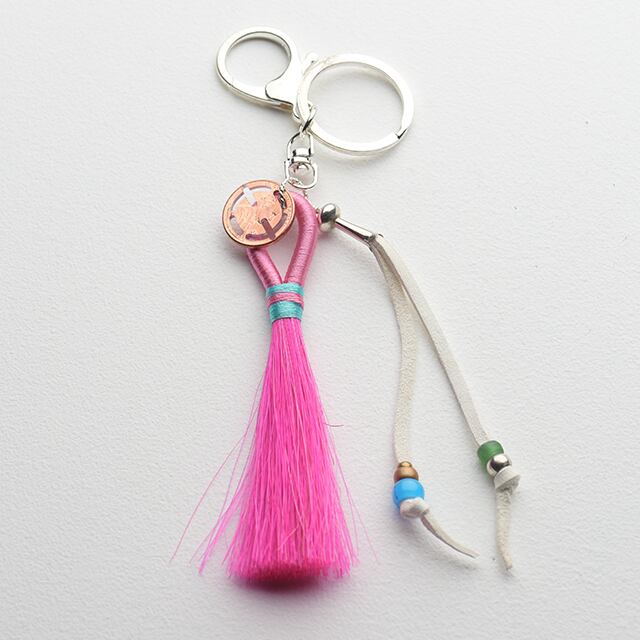 ホースヘアーを染めたフリンジやシルバー製のスカッシュブロッサム、EQ Lucky Pennyなどを組み合わせたキーリング。