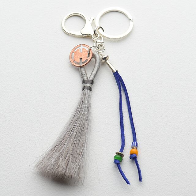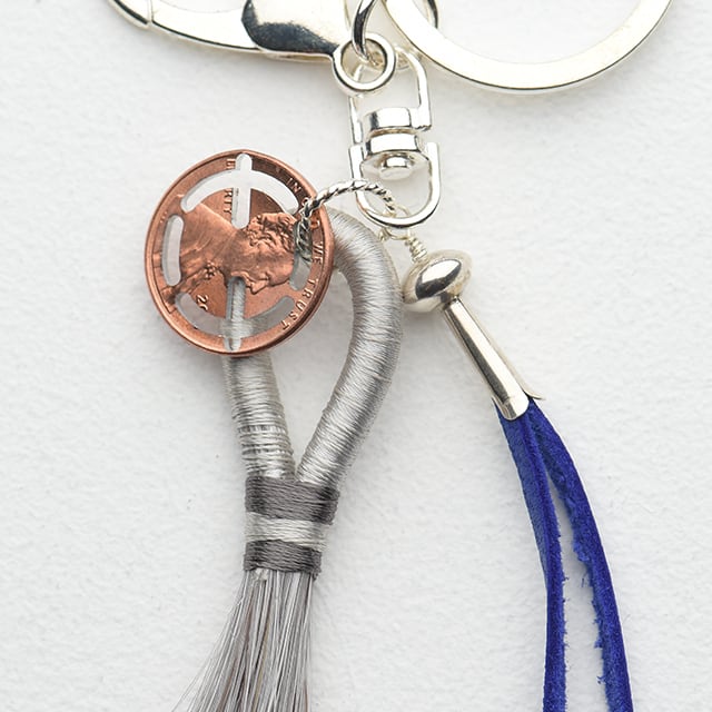 ホースヘアーを染めたフリンジやシルバー製のスカッシュブロッサム、EQ Lucky Pennyなどを組み合わせたキーリング。