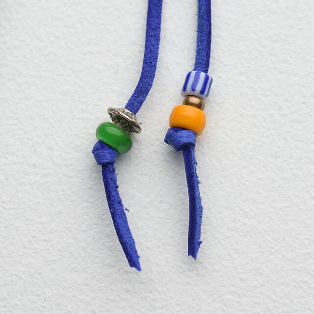 ディアスキンレースを手漉きし、1本1本ハンドメイドで作成しています。それぞれのビーズは、ベネチア、インド、アフリカなどで生産されたものを使用しました。それぞれの素材の経年変化が楽しめるポップなアイテムです。