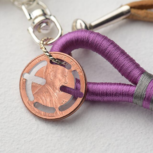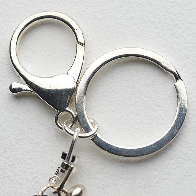 ホースヘアーを染めたフリンジやシルバー製のスカッシュブロッサム、EQ Lucky Pennyなどを組み合わせたキーリング。