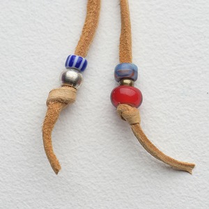 ディアスキンレースを手漉きし、1本1本ハンドメイドで作成しています。それぞれのビーズは、ベネチア、インド、アフリカなどで生産されたものを使用しました。それぞれの素材の経年変化が楽しめるポップなアイテムです。