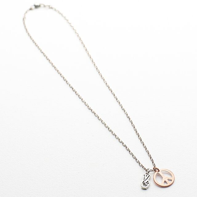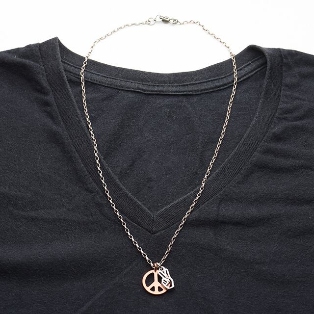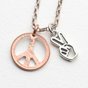 ピースマークをくりぬいたPennyとシルバー製のピースサインのチャームをペンダントヘッドにしたネックレスです。